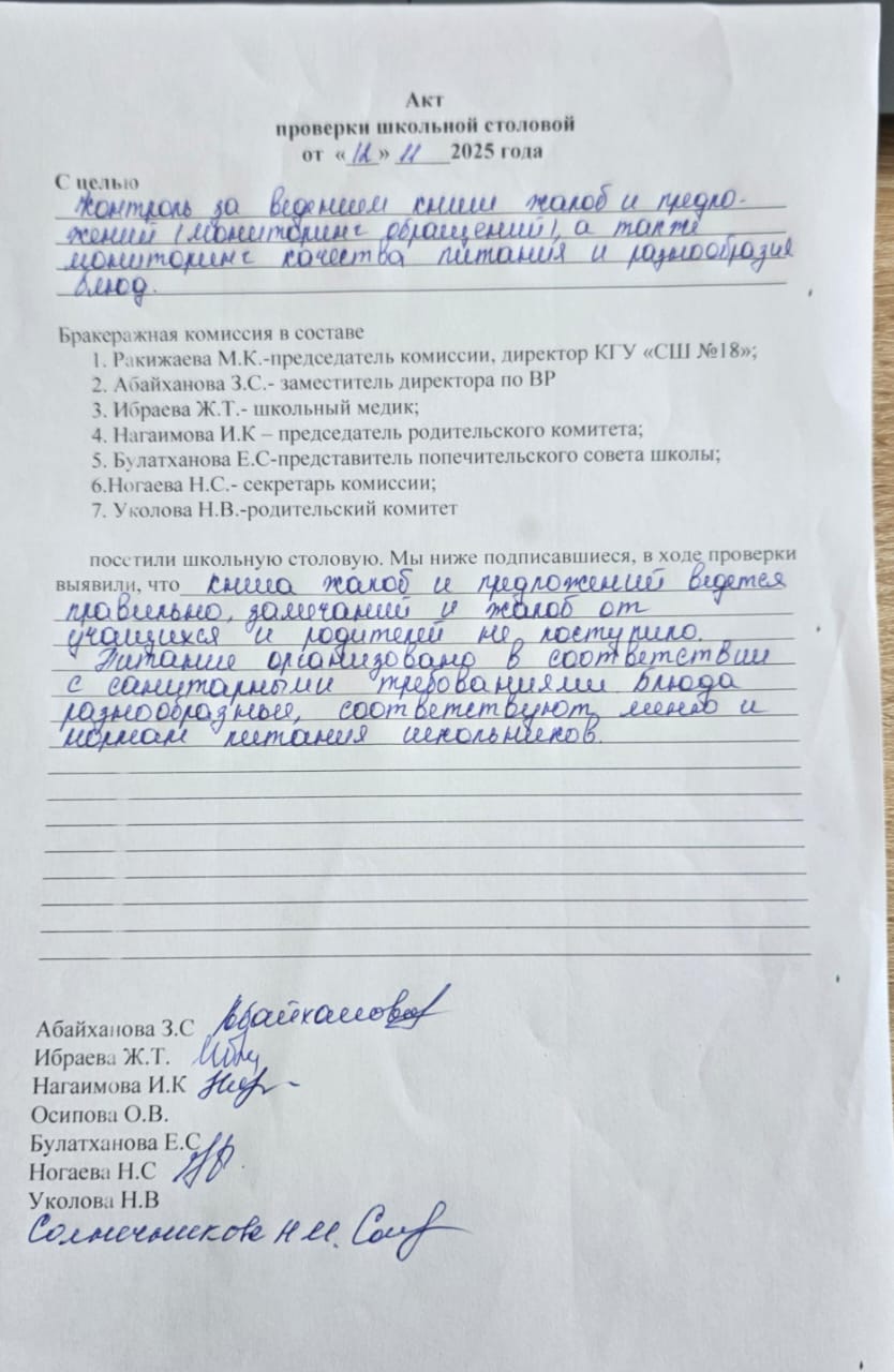 12 ноября 2025 года состоялось заседание бракиражной комиссии школьной столовой. Цель: контроль за ведением книги жалоб и предложений (мониторинг обращений), а также мониторинг качества питания и разнообразия блюд.